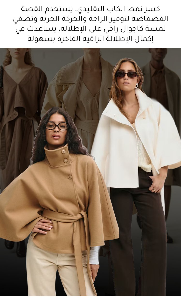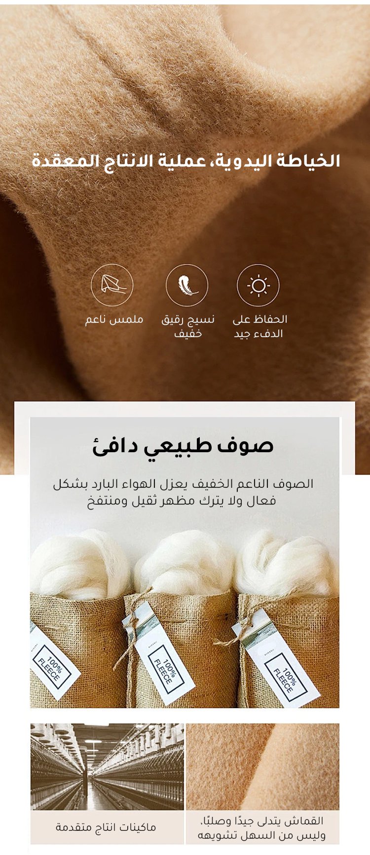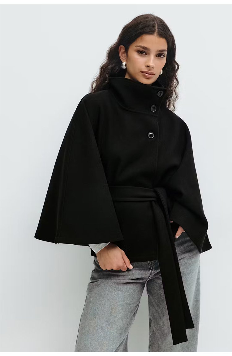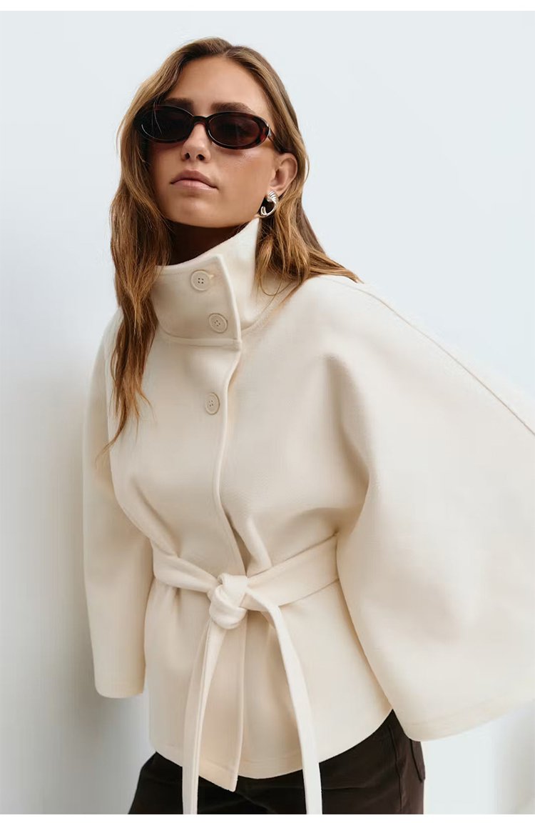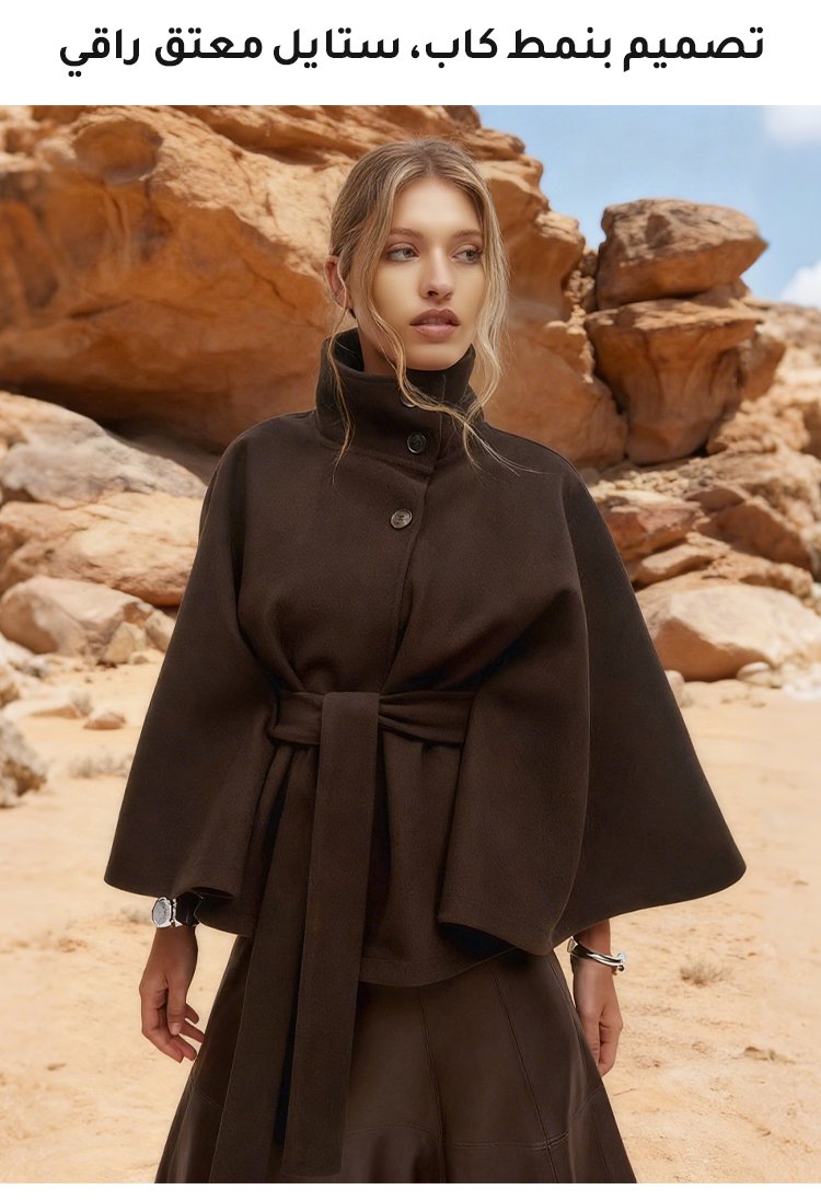 معطف صوف بنمط كاب ذو ياقة مرفوعة وحزام خصر بلون نقي